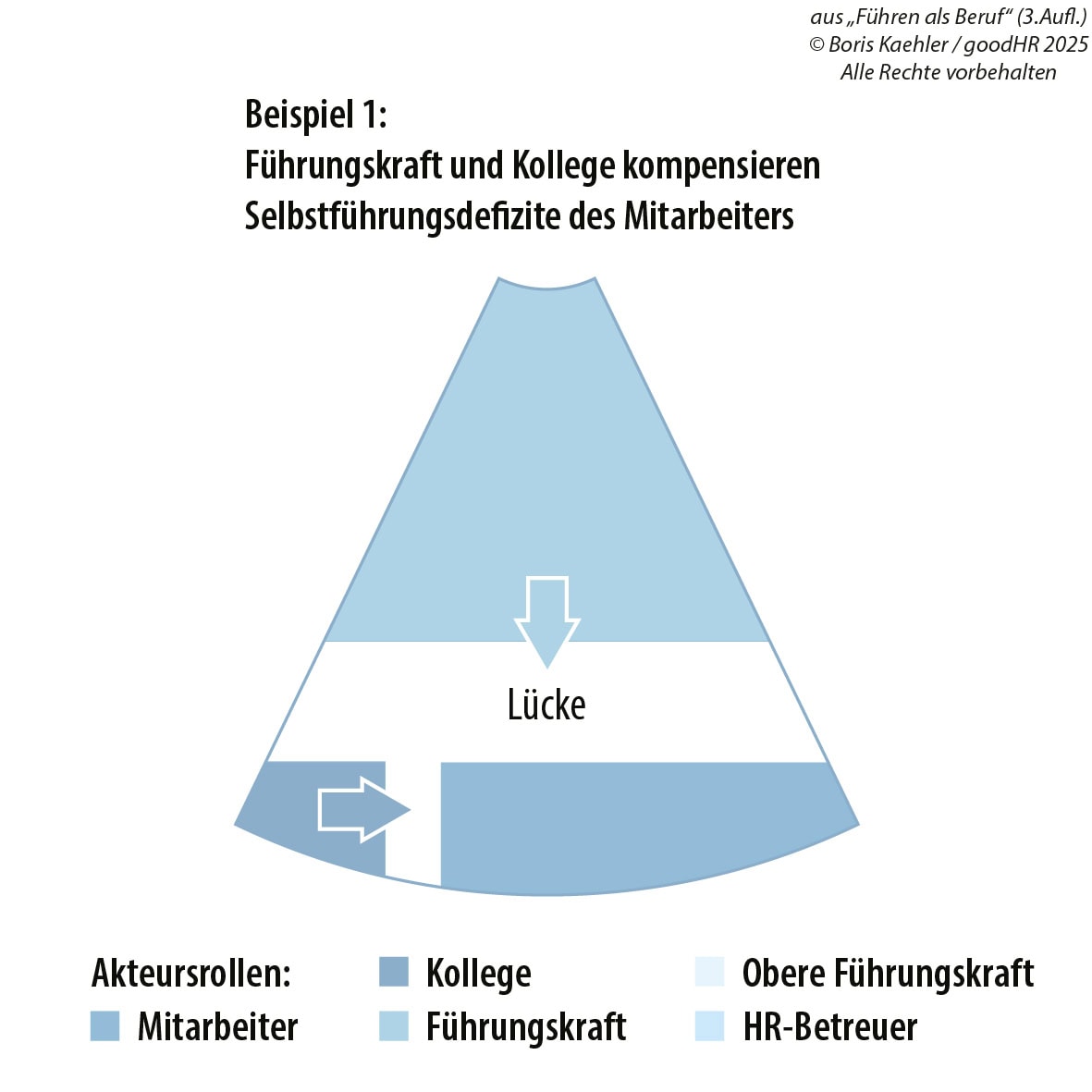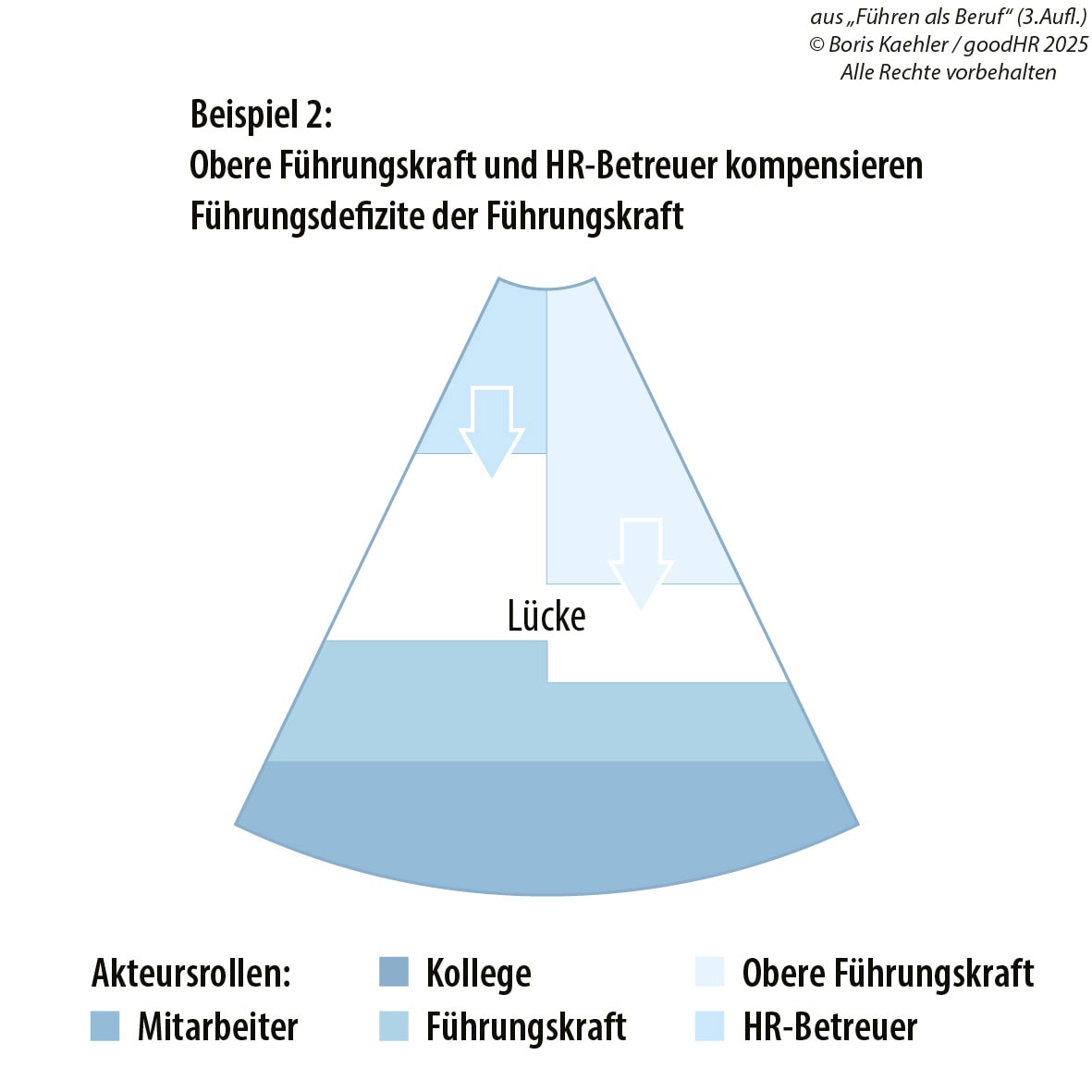 Nun sind Führungskräfte auch nur Menschen, und Führung ist auch nur Arbeit. Mit Führungsdefiziten ist also zu rechnen. Wenn Führung in Organisationen wirklich funktionieren soll, muss es demnach weitere Kompensationsmechanismen geben. Das Komplementäre Führungsmodell setzt diese in den Rollen der oberen Führungskraft und des Personalbetreuers um. Beide agieren im Verhältnis zur Führungskraft wie jene im Verhältnis zum Mitarbeiter. Das bedeutet, sie setzen primär auf die Selbststeuerung der Führungskraft und greifen (nur) bei Bedarf ein. Auf diese Weise entsteht ein robustes Gesamtsystem, welches sicherstellt, dass alle Führungsaufgaben im Hinblick auf alle Mitarbeitenden und Organisationseinheiten erfüllt werden.
